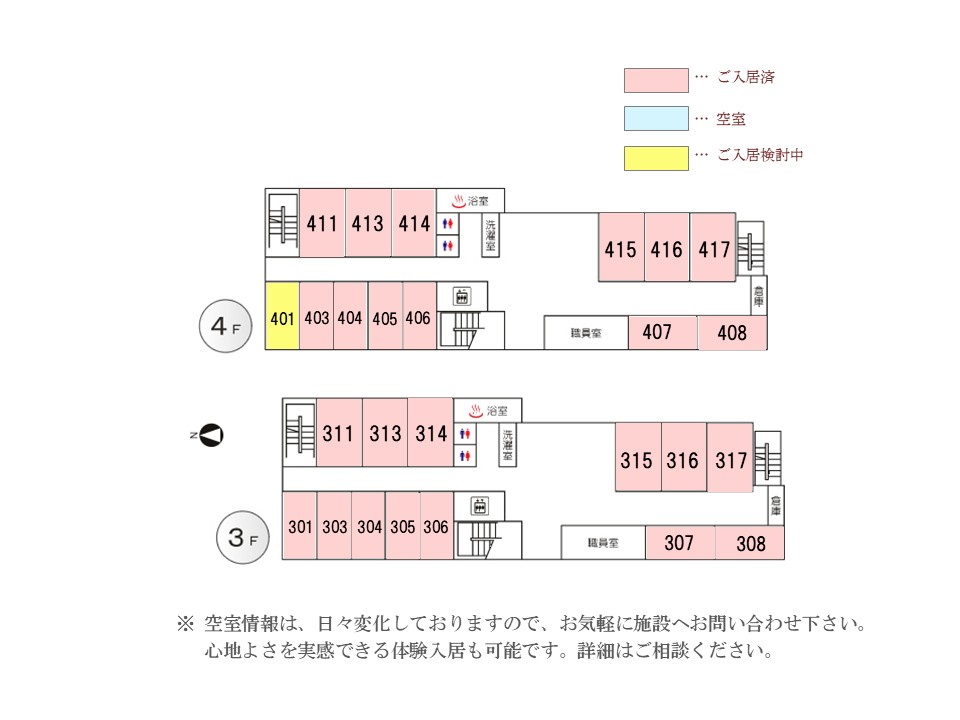 | 共用設備 | 食堂、リビング、ラウンジ、健康管理室、浴室 |