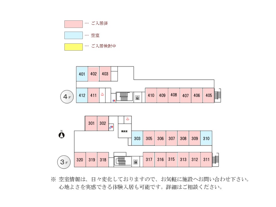 | 共用設備 | 食堂、リビング、ラウンジ、健康管理室、浴室 |